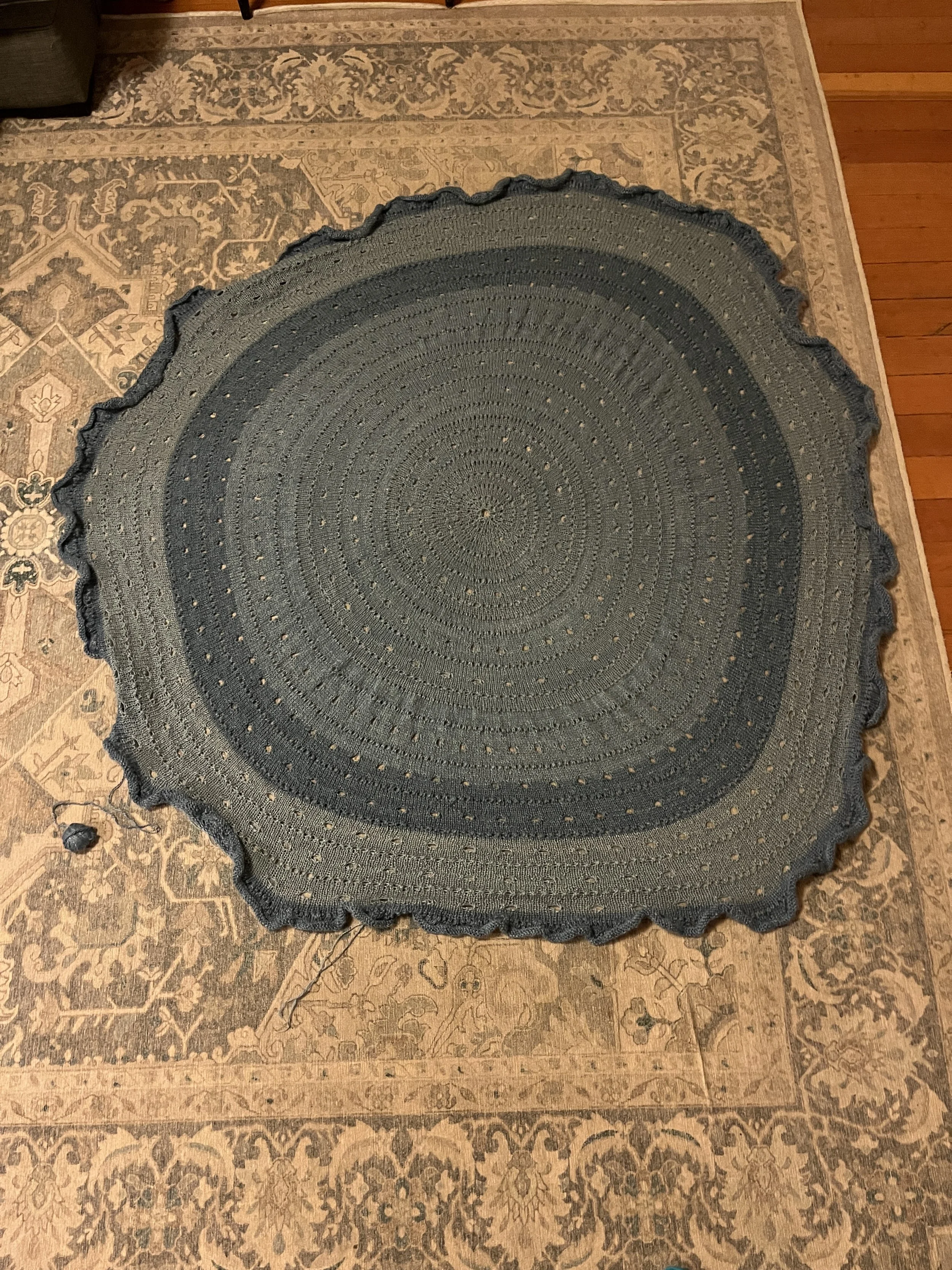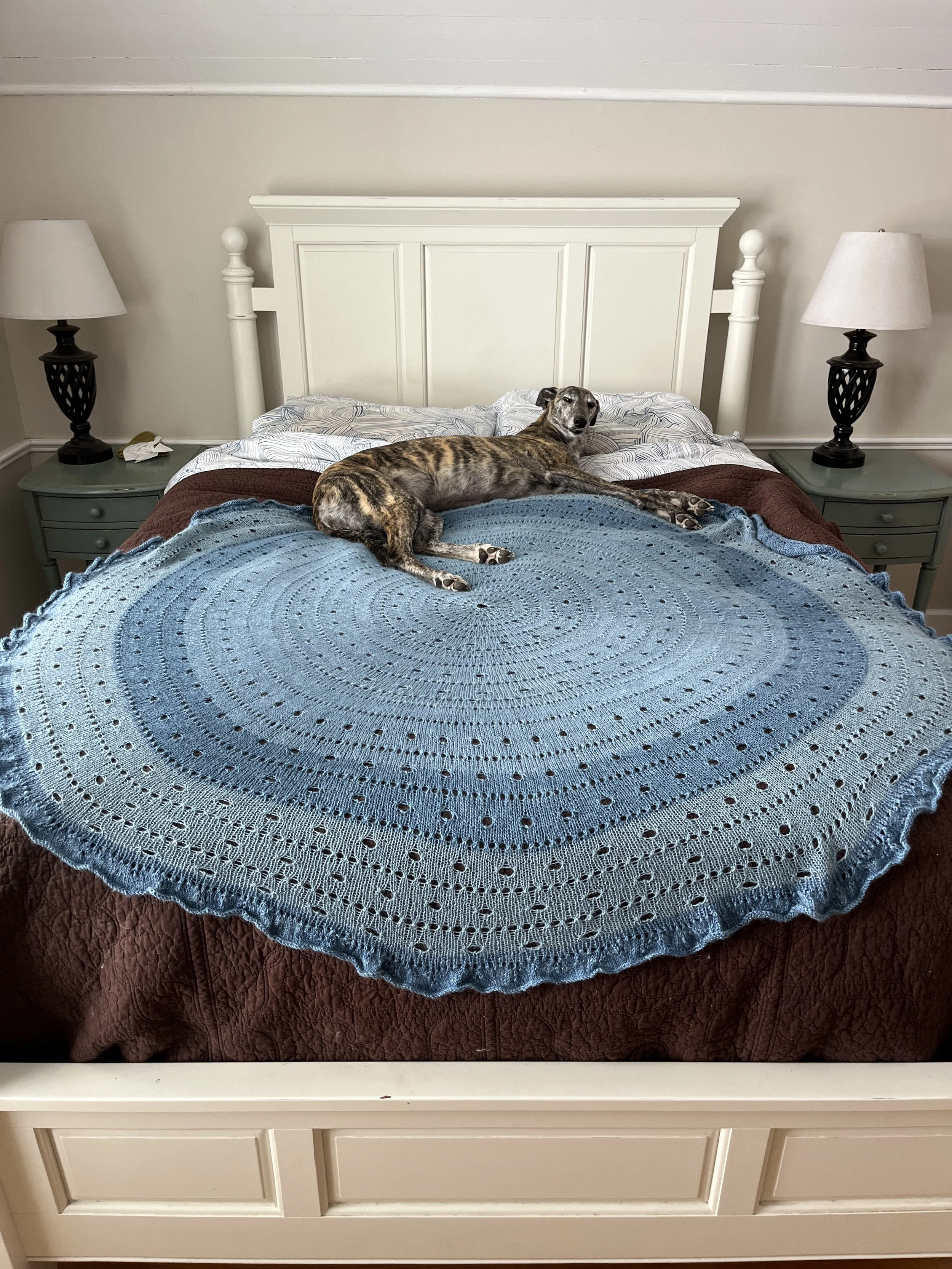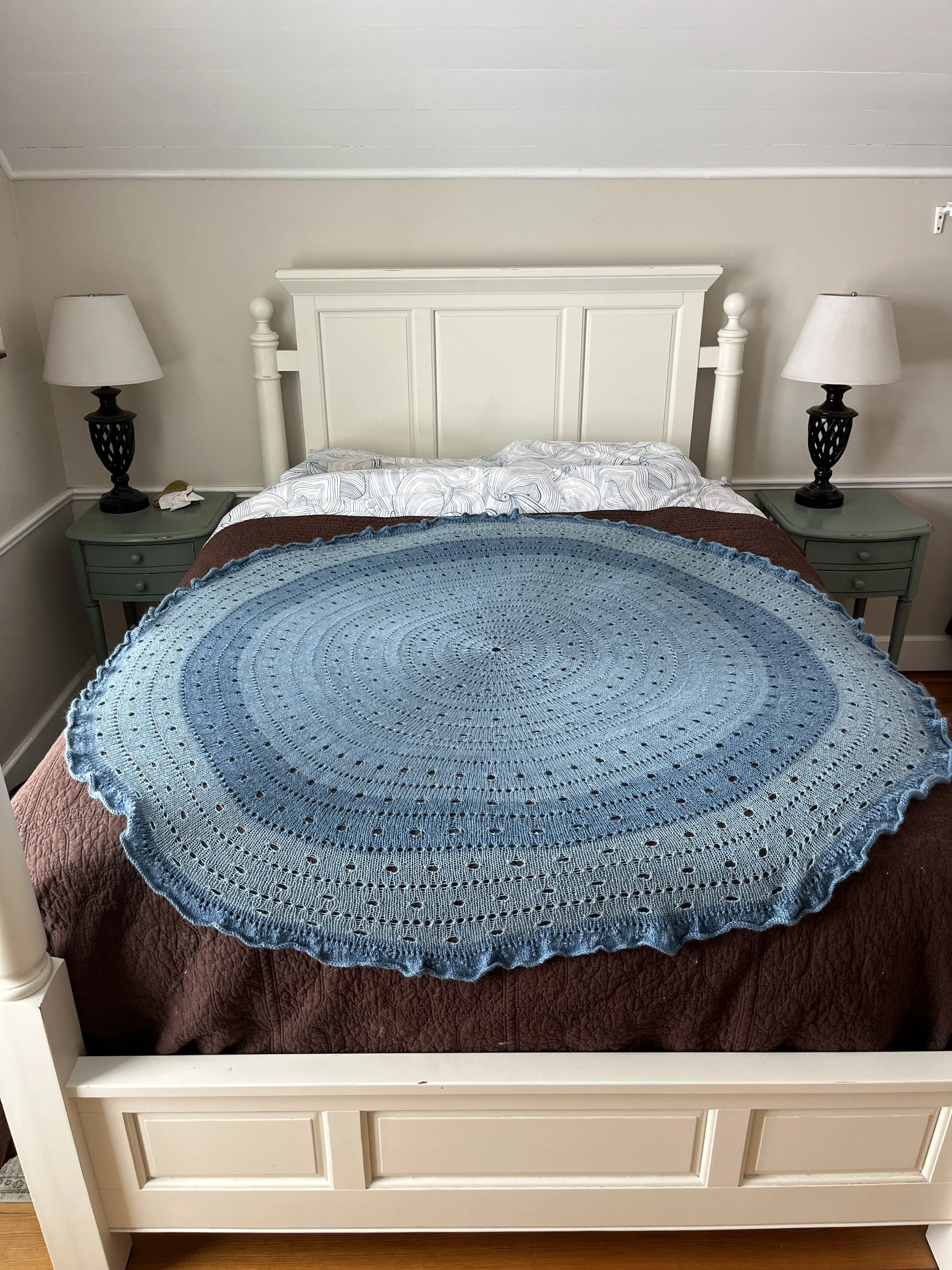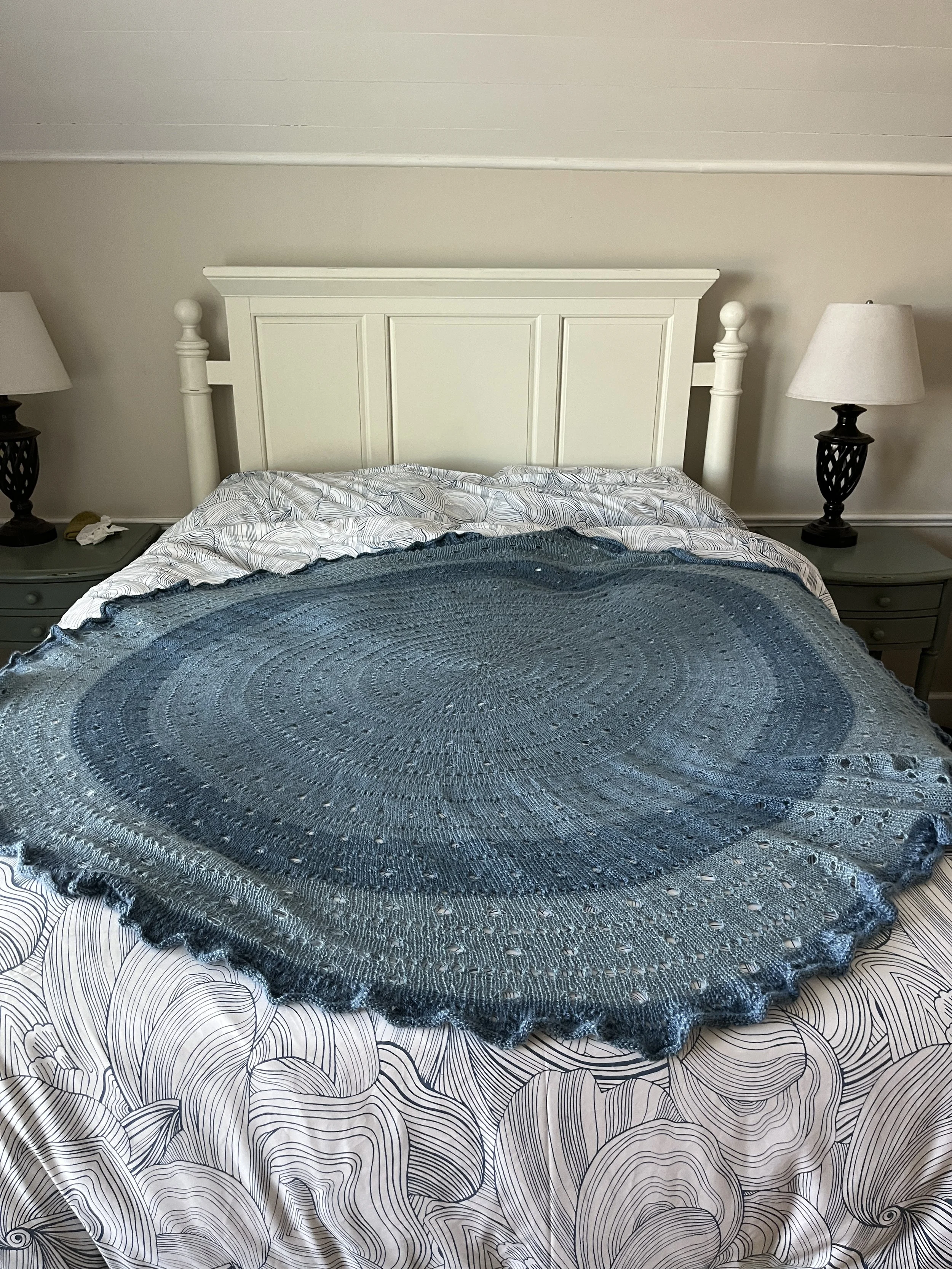 I bound off the last stitch on April 1, 2023. The bind off round was nearly 1200 stitches so that was like a victory lap.