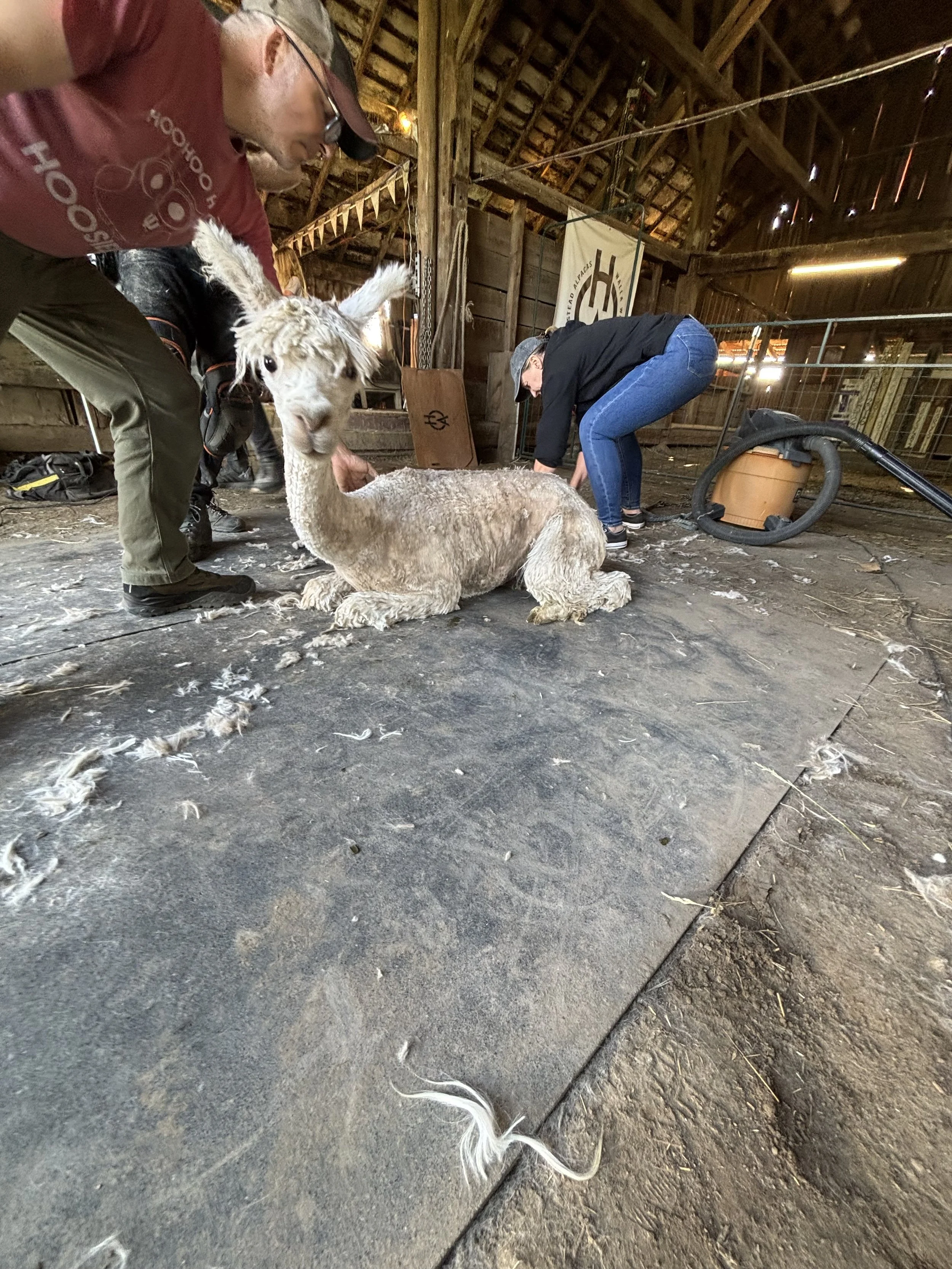 Our shearer uses the rope-and-pulley method. The ropes and pulley attach to stakes that we temporarily pound into the ground. Then ropes are fastened around the alpacas ankles/feet to allow us to gently lay them out on the mat.