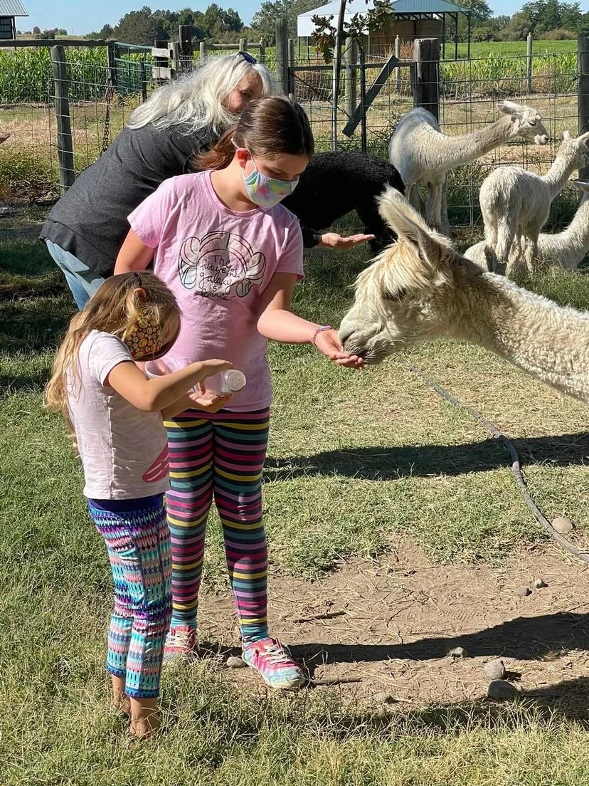 I’ll hand everyone a plastic cup of kibble — the alpacas favorite snack — and then we’ll go inside the barnyard enclosure to mingle with the alpacas and let them eat out of your hand.