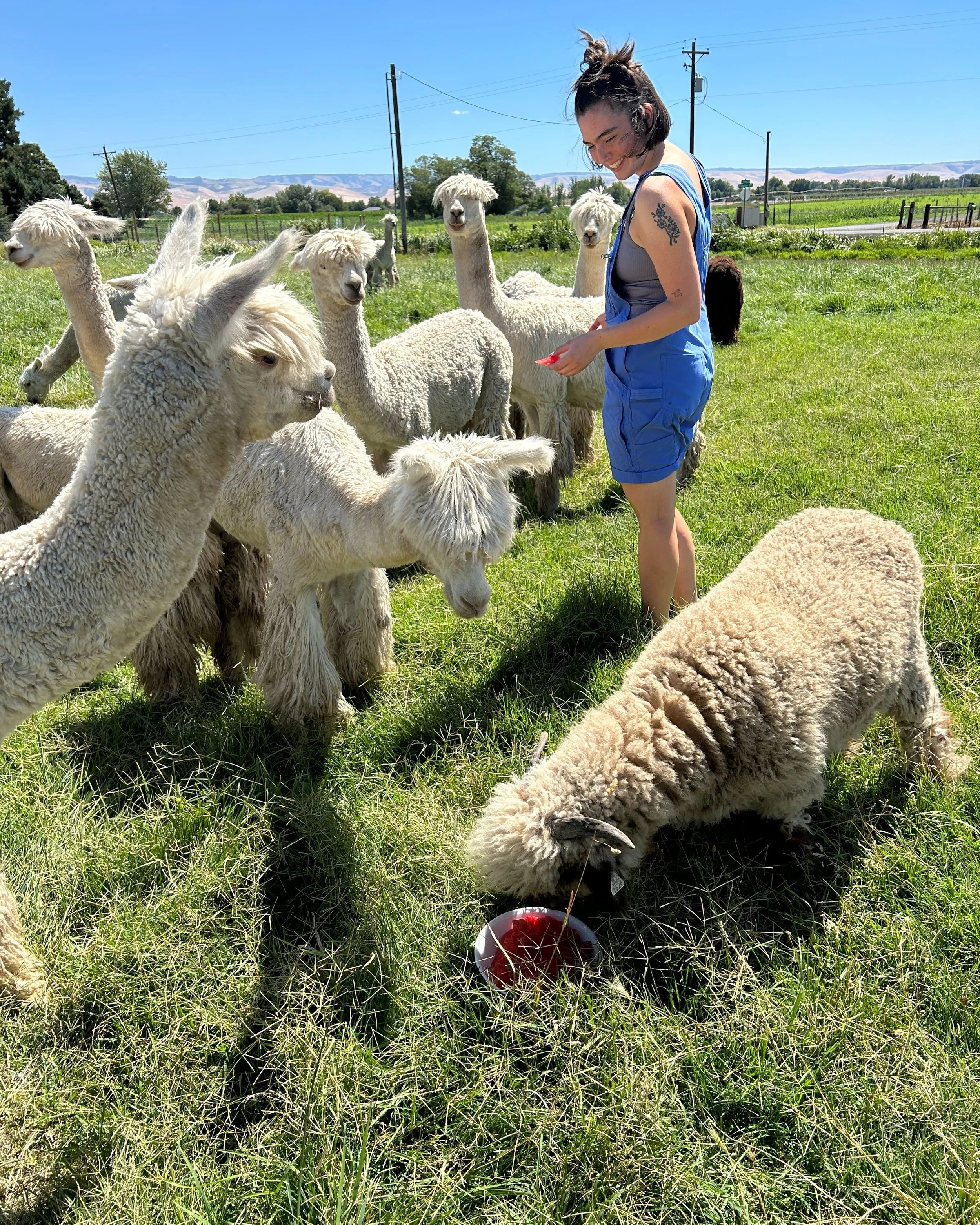 The alpacas presence alone naturally brings up many questions about their fiber, fiber uses, temperament, native origins, relation to camels, and everything in between. Learning about alpacas while hand feeding them has a way of teaching that locks in the memory for years to come!
